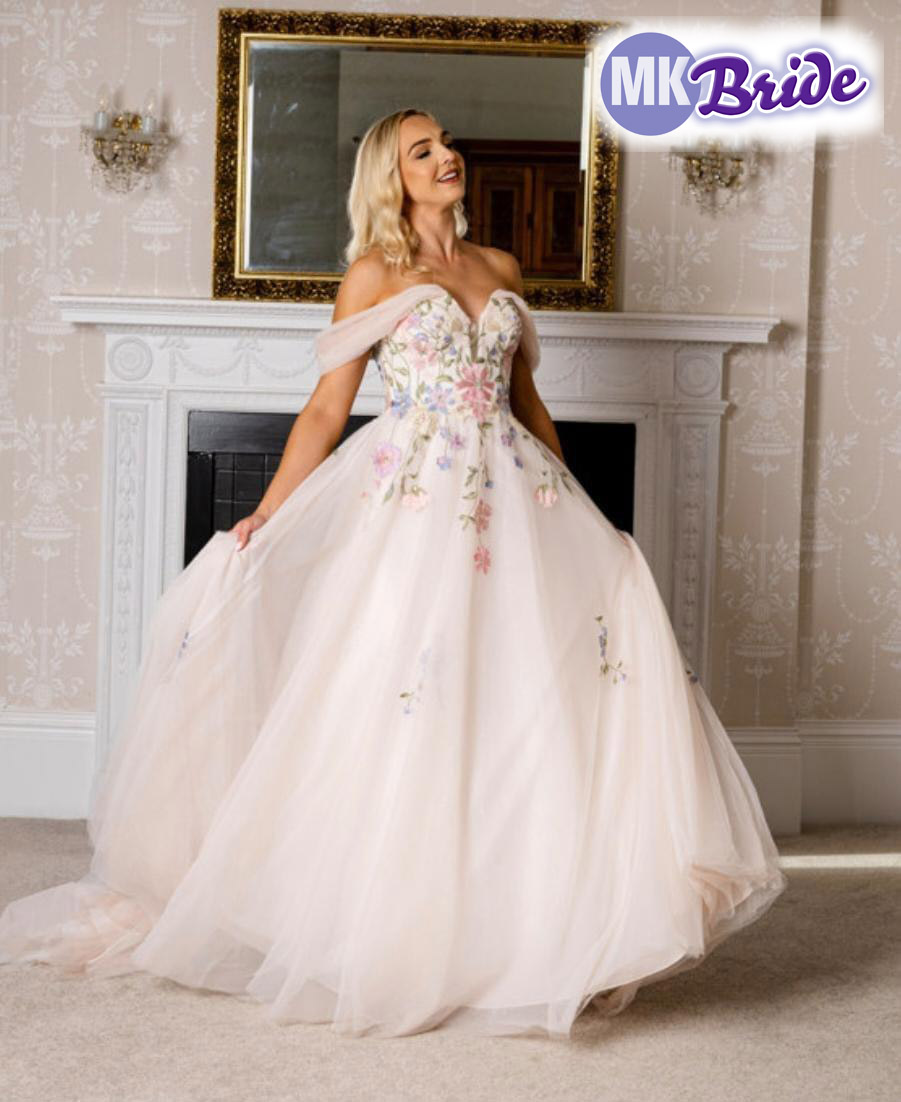 Brides are choosing reception dresses to keep their ceremony gowns pristine and to dance with total freedom. A second, lighter look means easier movement, happier photos and zero stress about spills. Our featured style is a blush tulle mini with pastel floral embroidery—floaty, flattering and ready for the dance floor. Visit MKBride to find your perfect reception gown and keep the party effortless.